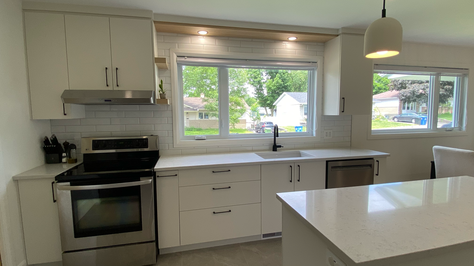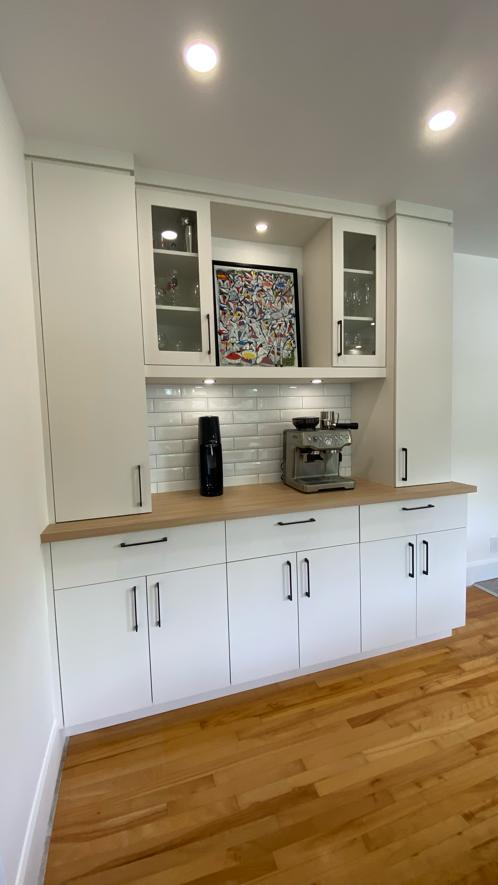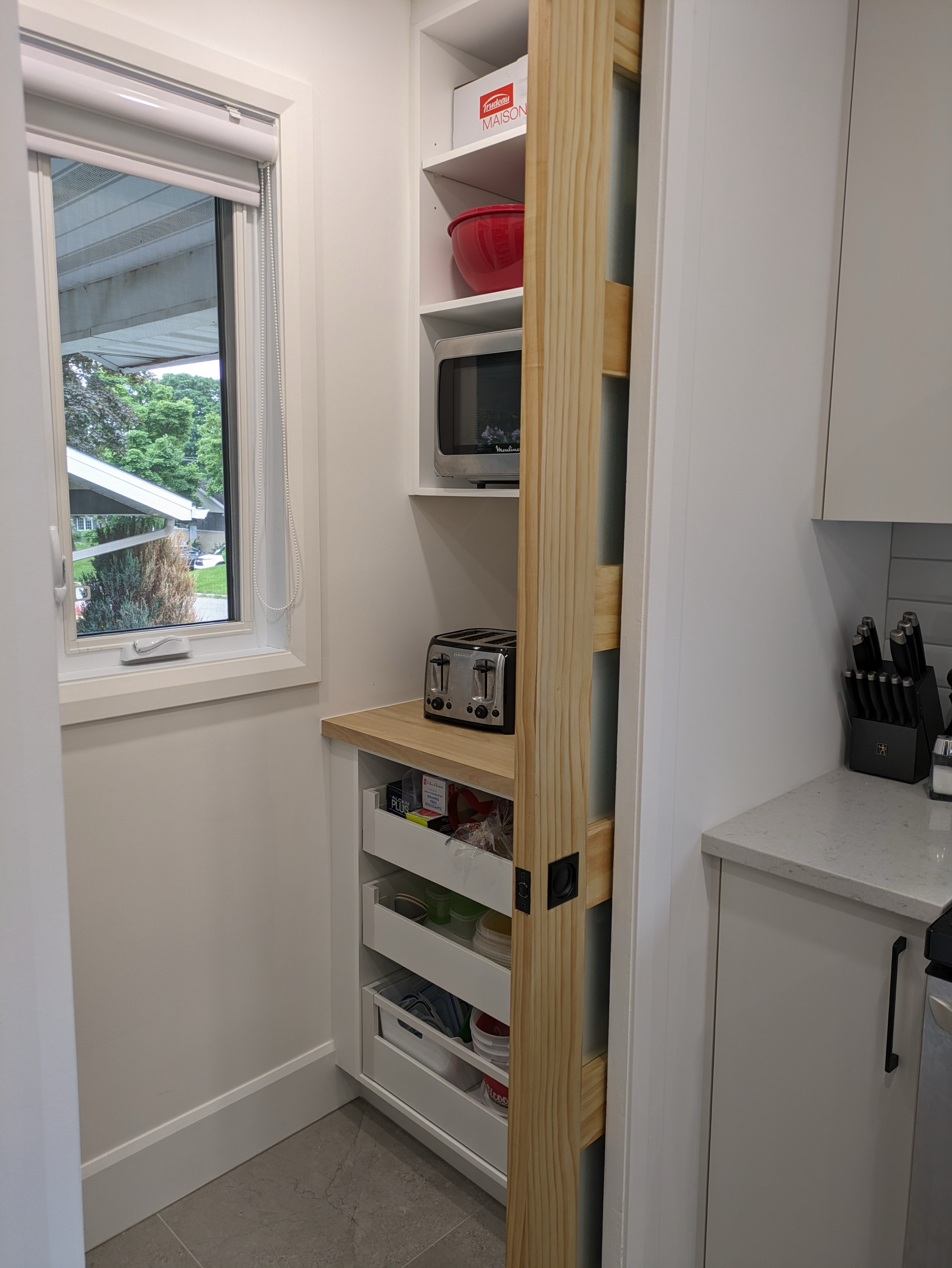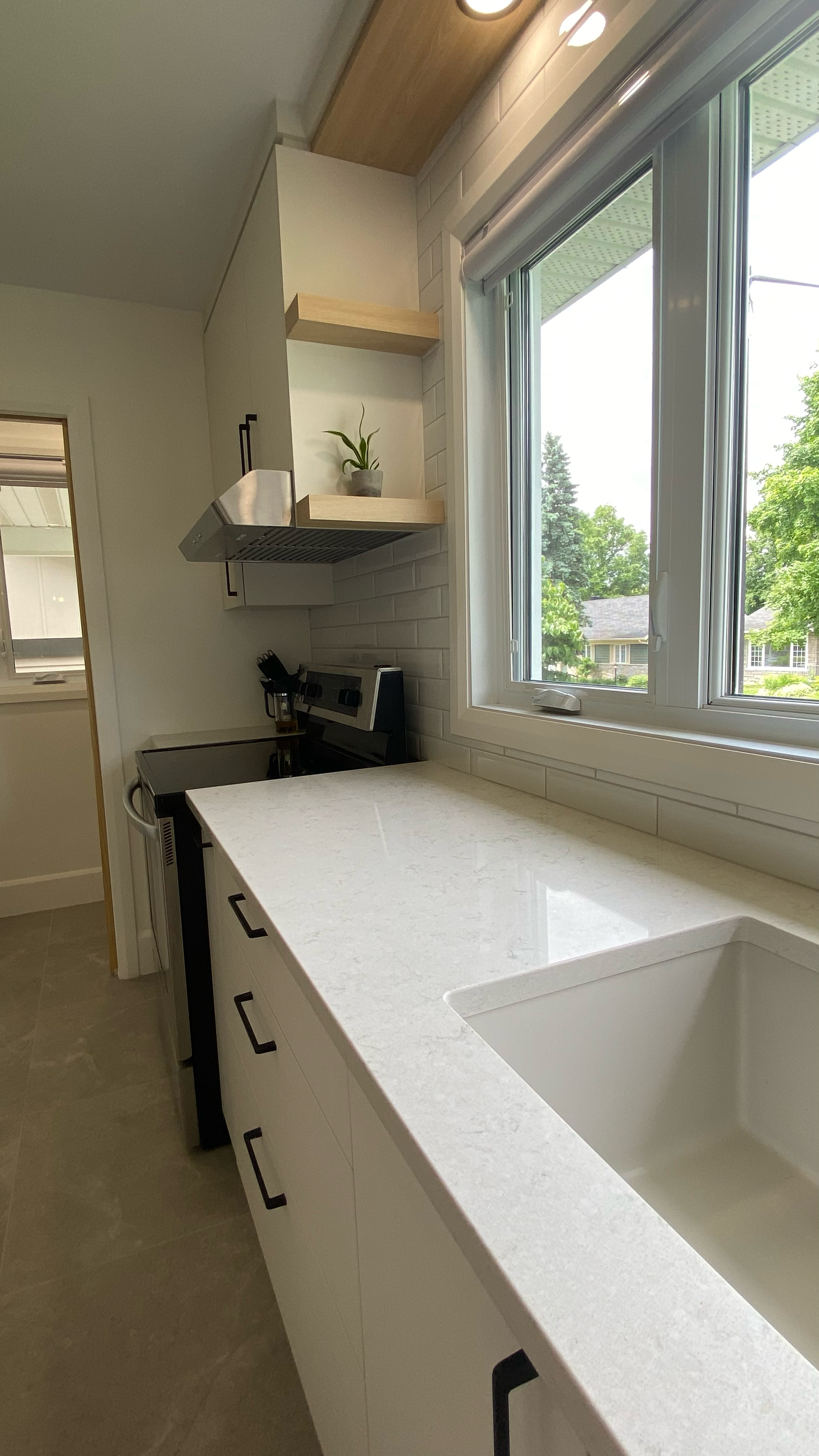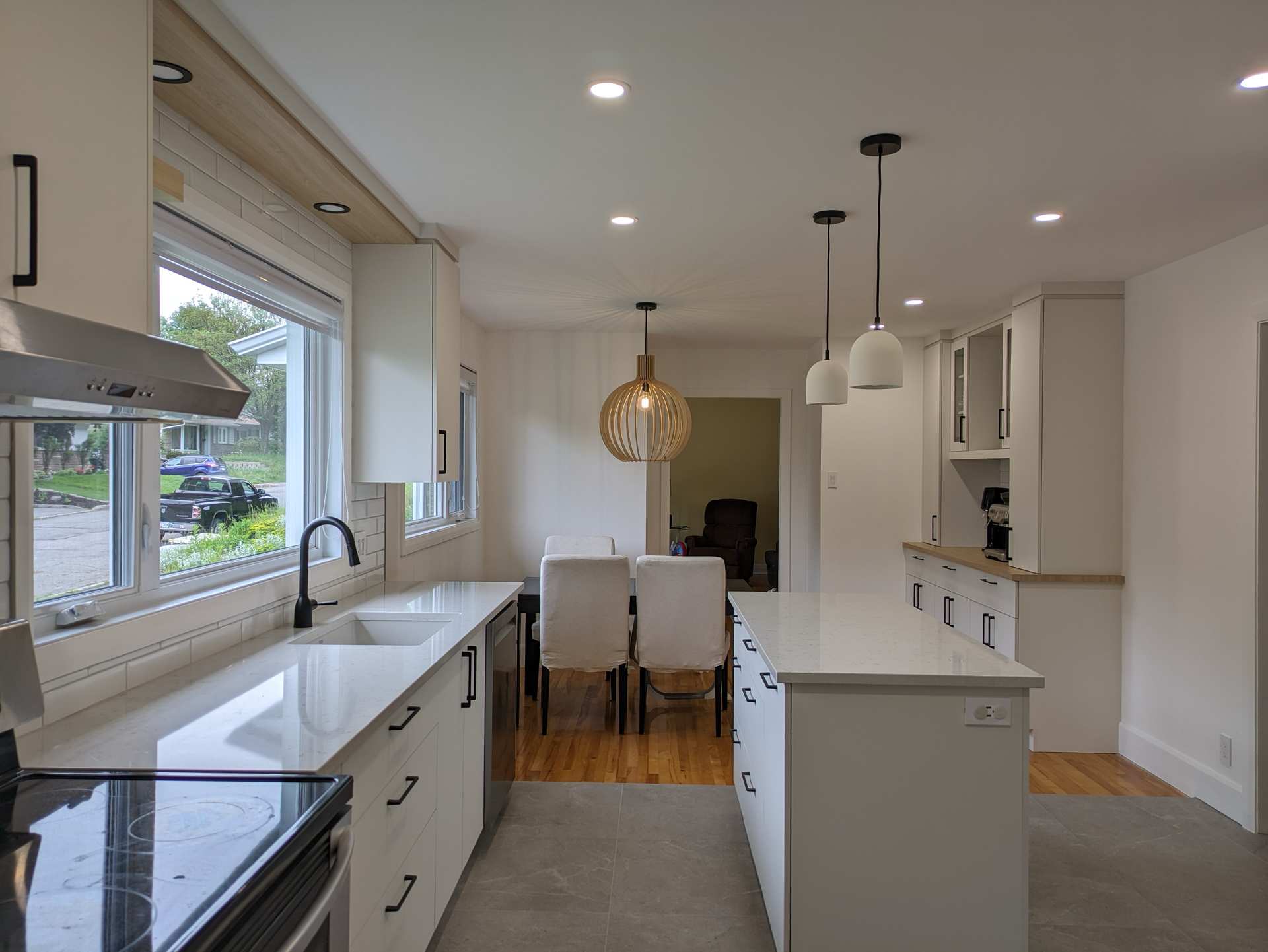 This kitchen has been completely transformed: the elongated plan accommodates a central island, a storage unit including a coffee area and a walk-in pantry, creating a fluid and harmonious space.